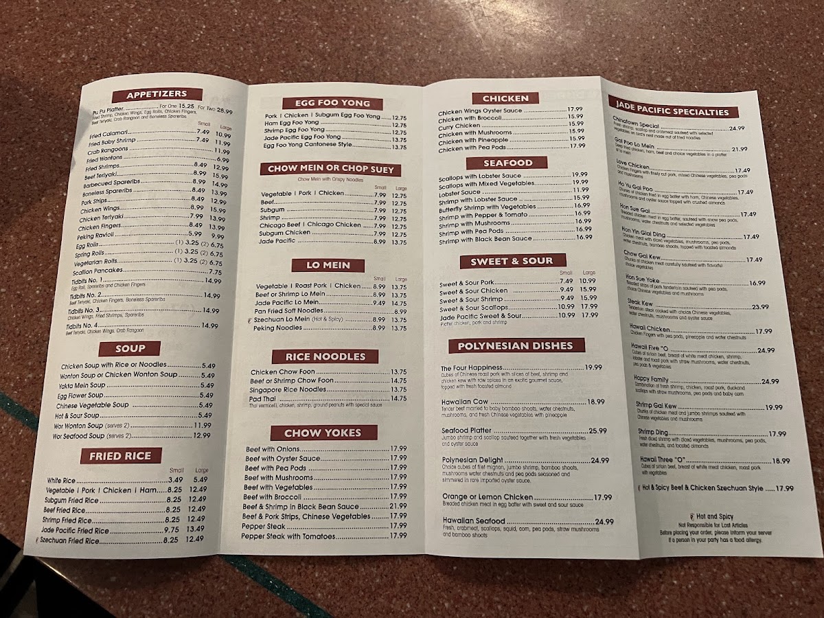 Jade Pacific Egg Foo Young typically includes a blend of seafood and vegetables, encased in egg, and served with a savory gravy.